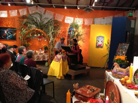 In 2004, Margie Helm and the Petaluma Día de los Muertos Committee offered to bring the event into the community and to help sponsor bilingual poetry writing workshops and the Poesía del Recuerdo/Poetry of Remembrance evening event. This was my first year as Sonoma County Poet Laureate, and one of my PL projects was to create more links between our Spanish speaking and English speaking literary communities. Copperfield’s Books hosted the workshop and reading, and in the years that followed, we had other venues including the Petaluma Public Library, the Petaluma Historical Library, and the Petaluma Art Center. The Art Center’s annual display of Day of the Dead altars and art provided an extraordinary backdrop for the readings. The evening event grew to include a ritual opening, a sit-down pot-luck dinner with homemade tamales, leche flan, Mexican hot chocolate, and favorite foods of those whose memory we were honoring. Every year people from the community came to light candles on our community altar, and to share their poems and remembrances, and a core committee worked to make each year’s event special.